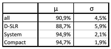我们将测试设备分为三类。“D-SLR”都是使用镜面的相机。“系统”是指没有镜子但带有可互换镜头的摄像机,“紧凑型”摄像机有一个固定的镜头。图1显示了精度和可重复性的差异。 我们比较了所有类型的镜头,而我们只使用了变焦镜头的最短焦距。以AF序列的所有测量结果的AF精度的平均值报告为μ。我们看到,系统和小型相机显示出更高的精度。虽然小型相机平均提供近95%的自动对焦精度,但是单反相机的自动对焦精度不到89%。